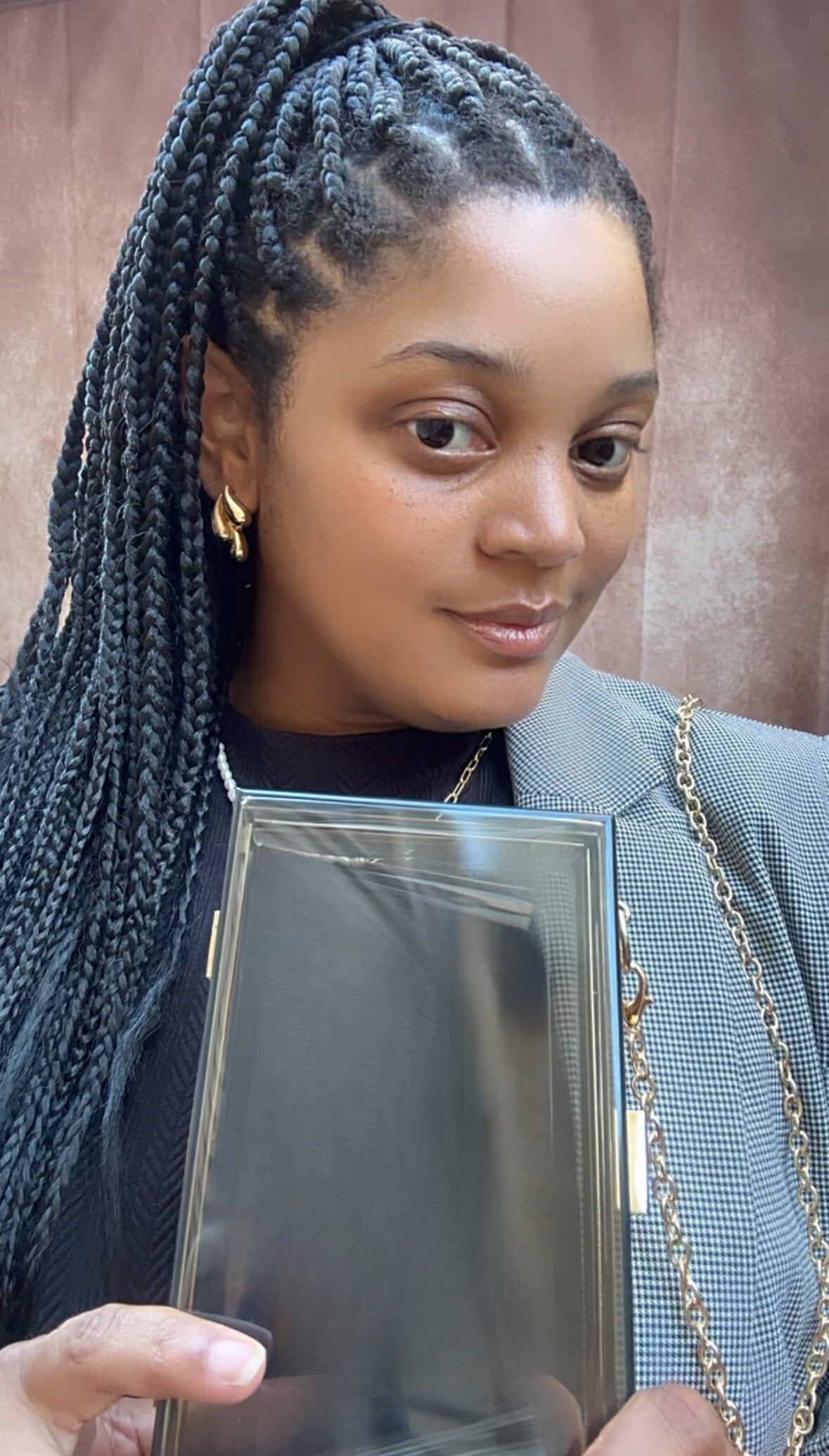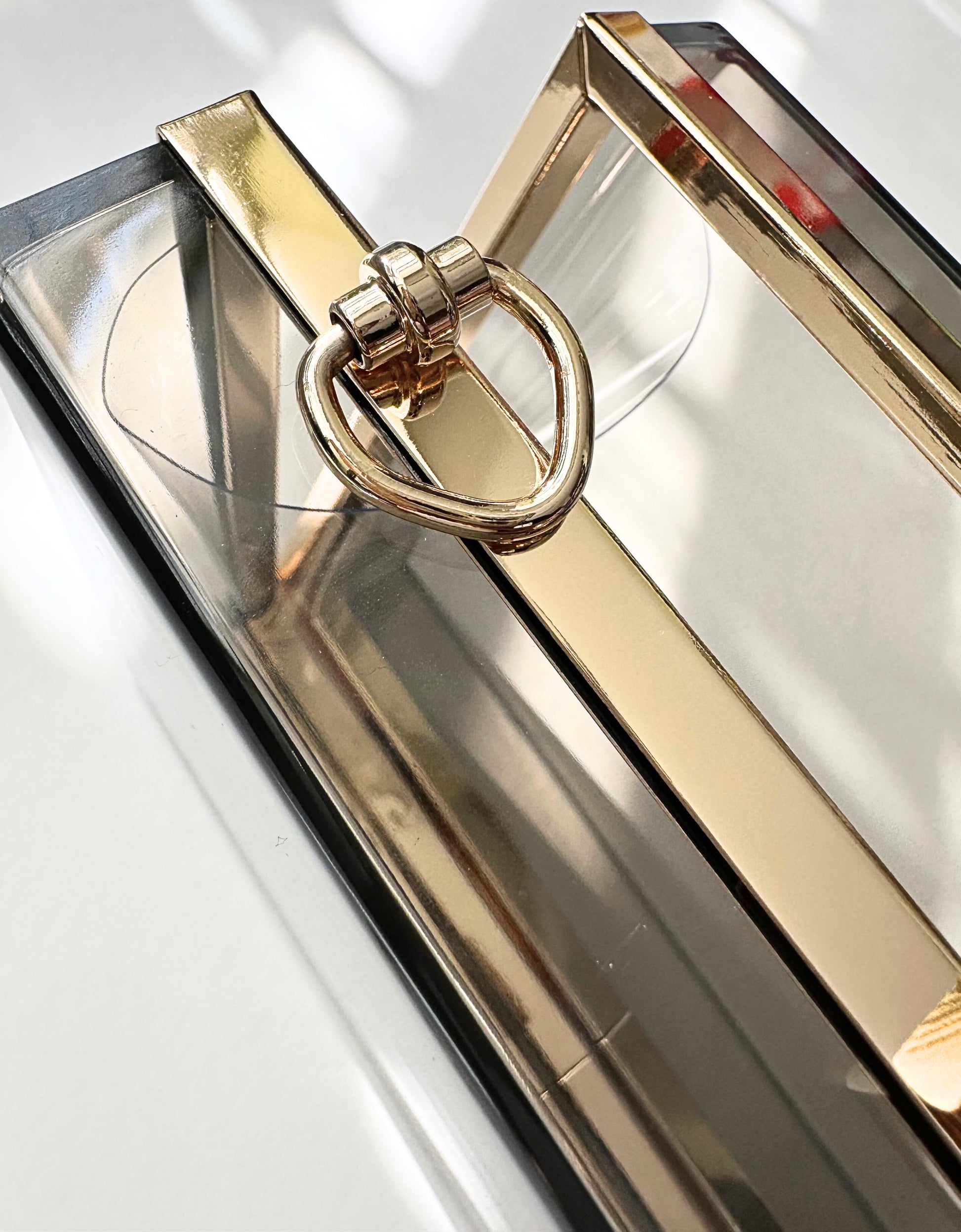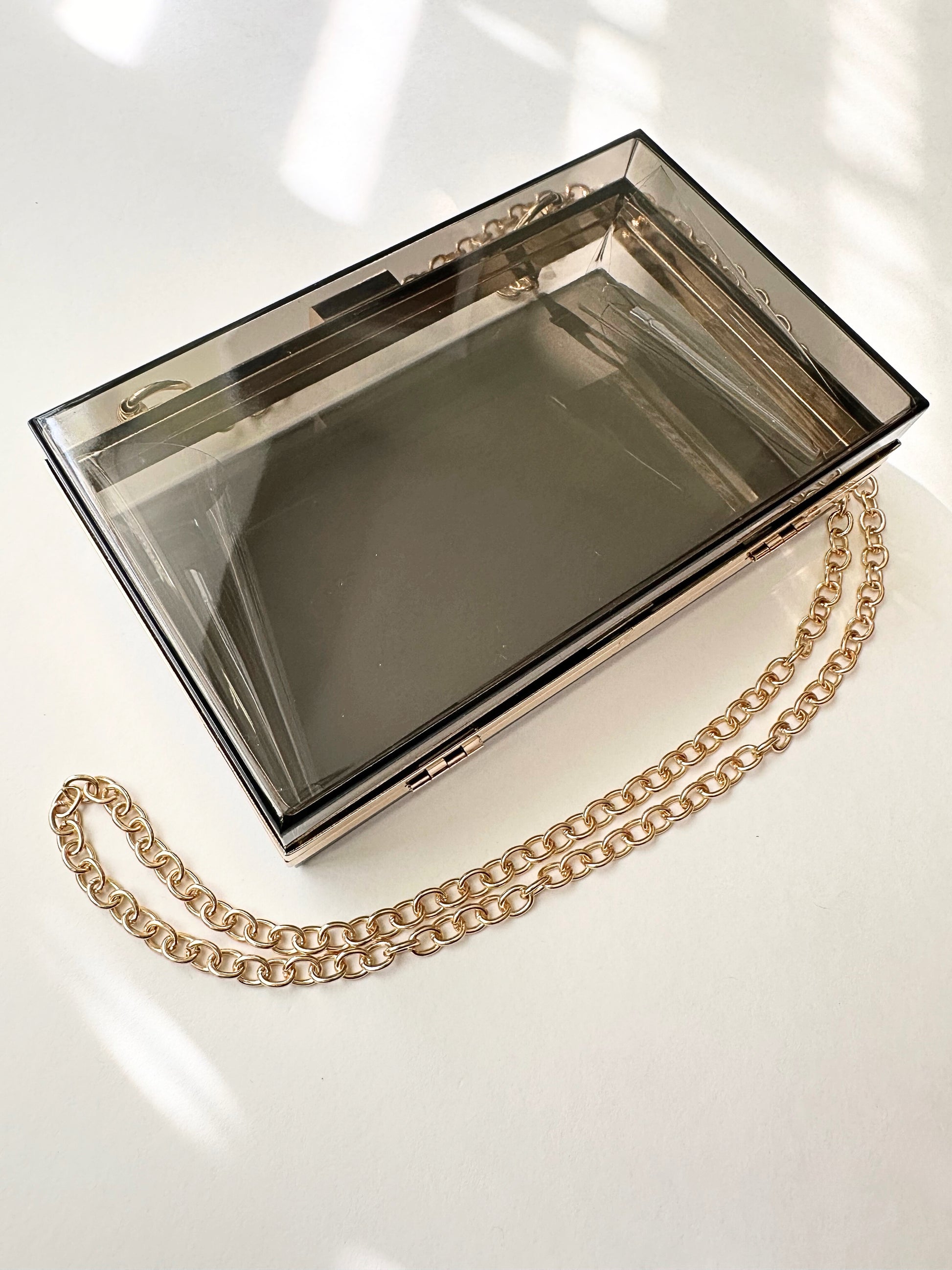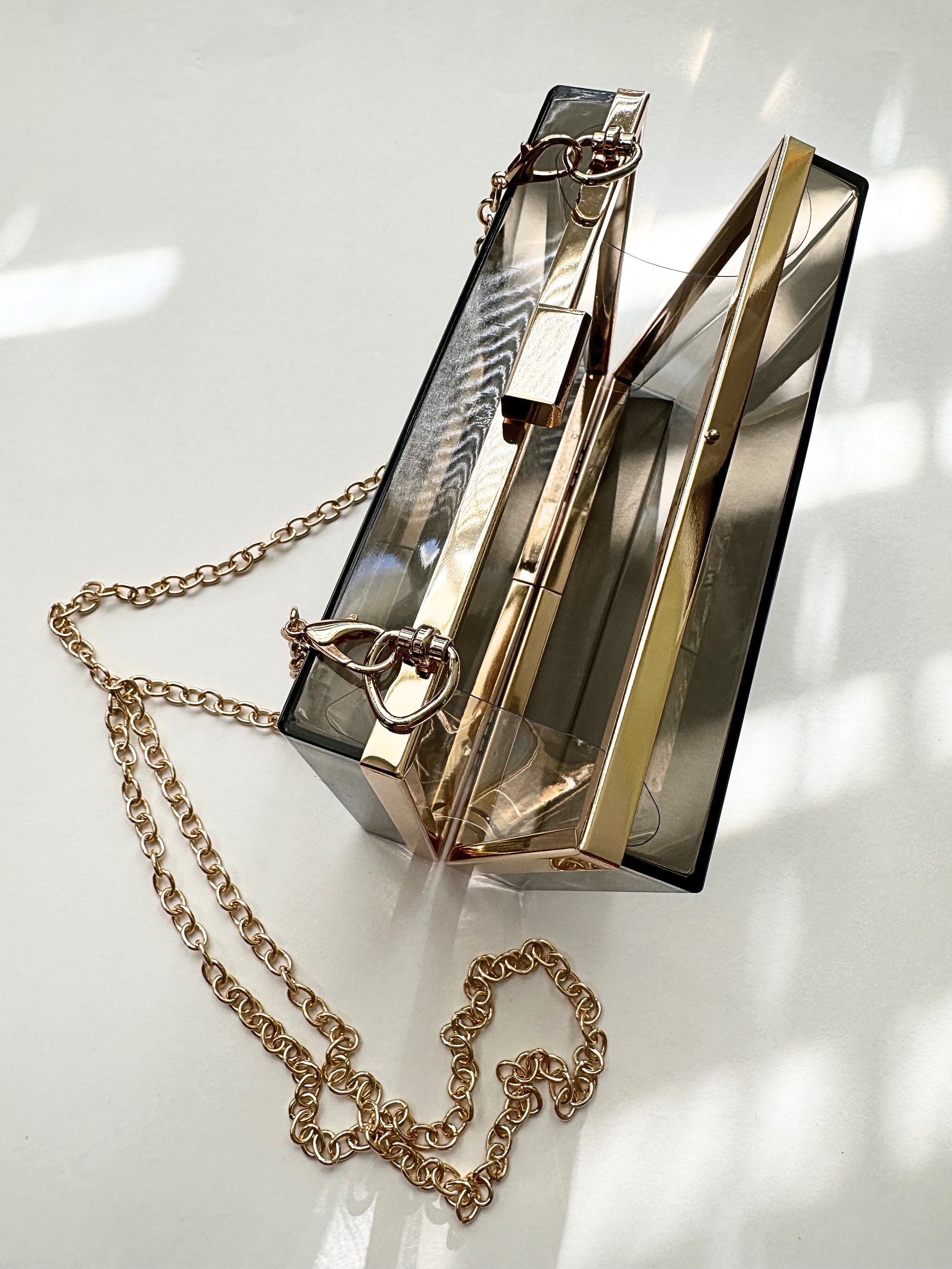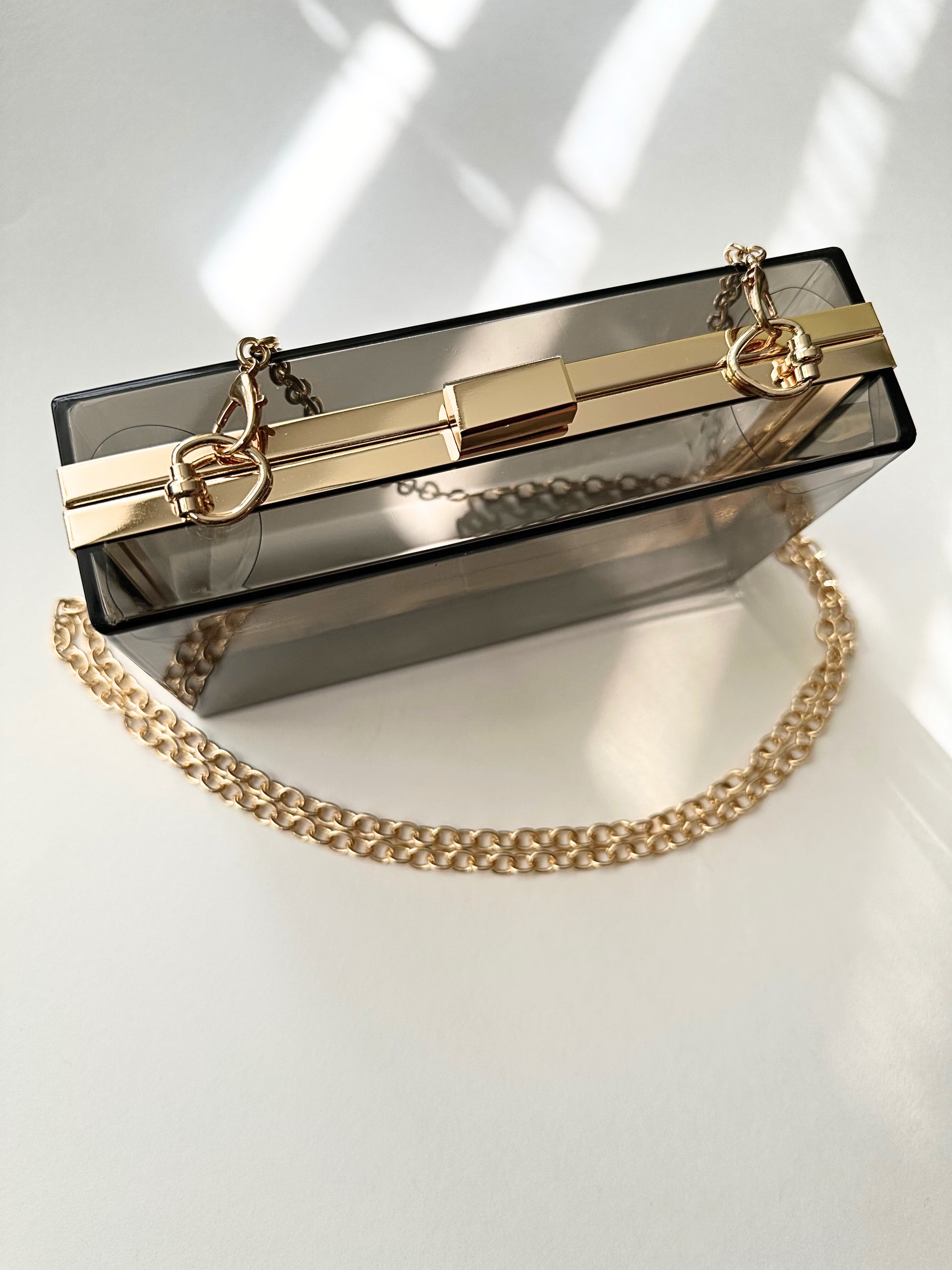 Elegant clear gray acrylic evening clutch with detachable gold-toned chain. Holds all of your essentials: wallet, keys, phone, and cosmetics. Clutch measures 4.1 inch x 7.1 inch x 2.2 inch. Unlined. Kiss lock. A lovely handbag perfect for a concert, girl's night out, or date night.