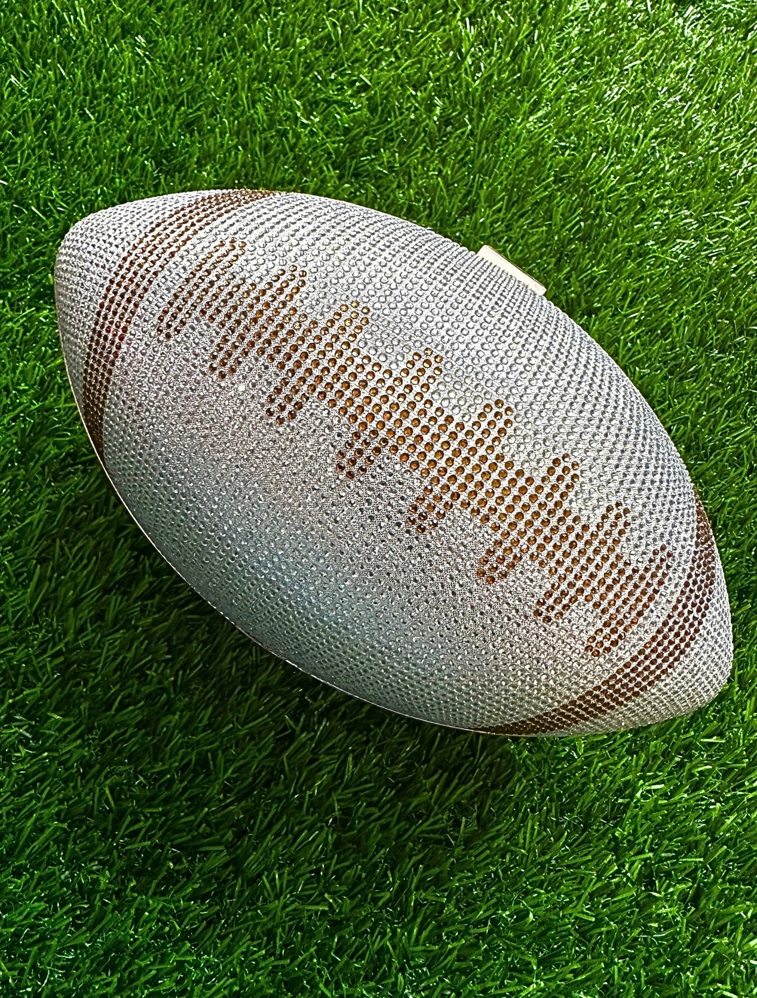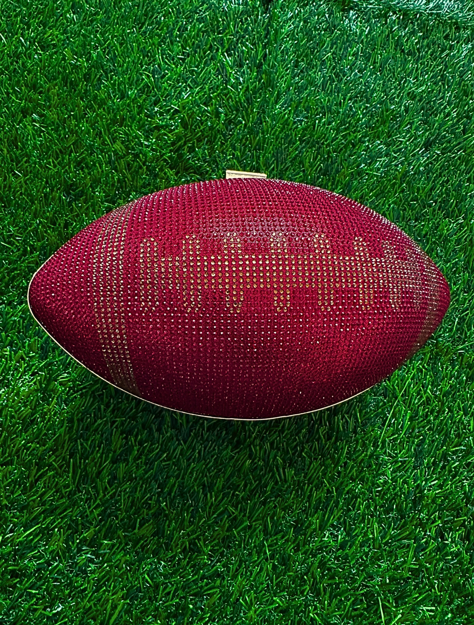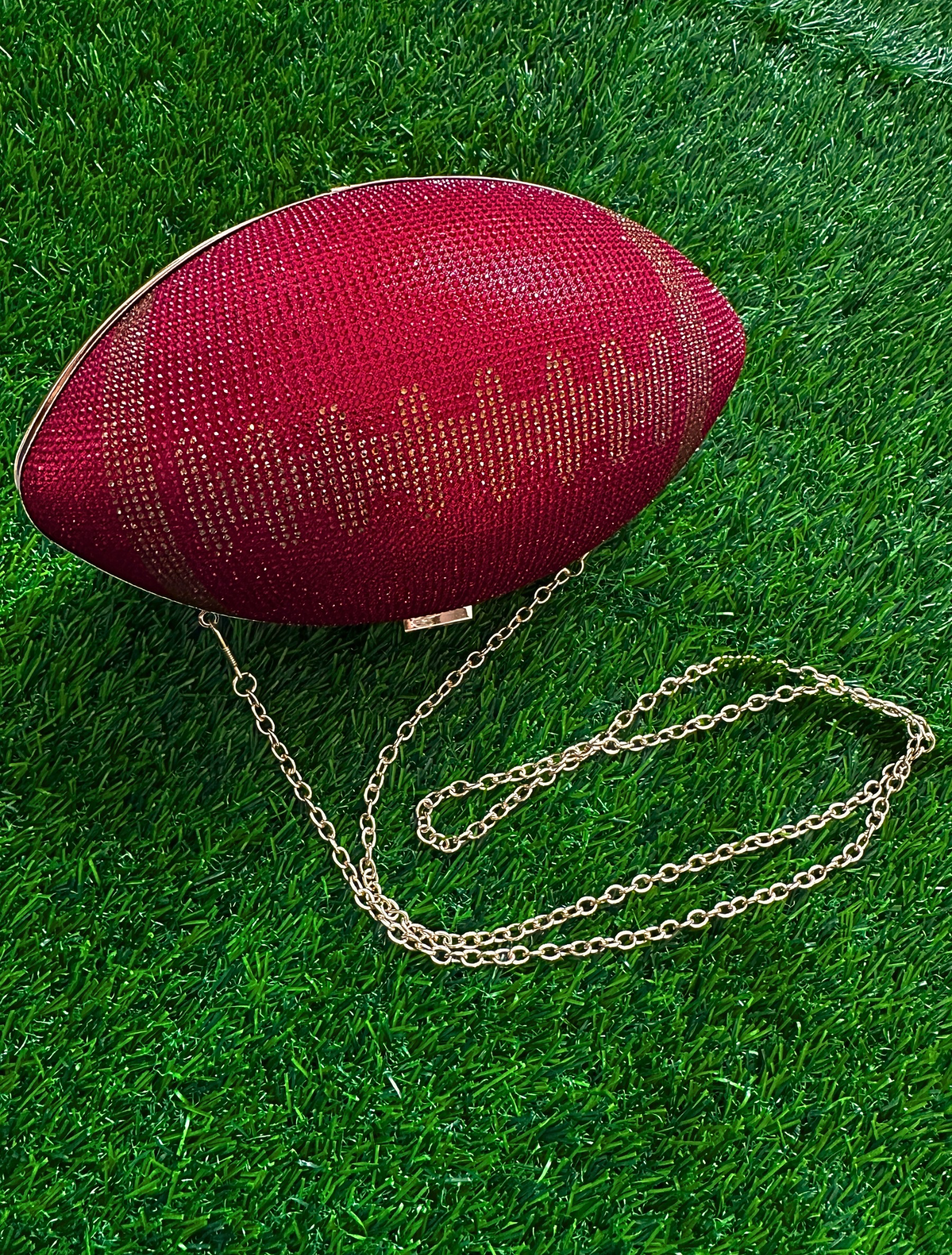 Score style points with this intricately rhinestone-embellished football clutch. Holds all of your essentials: wallet, keys, phone, and cosmetics. Clutch measures 9.4 inch x 5.5 inch x 5.1 inch. Polyester lining. Kiss lock. Removable gold-toned chain strap. Add a playful twist to your look for the big game with this statement bag!