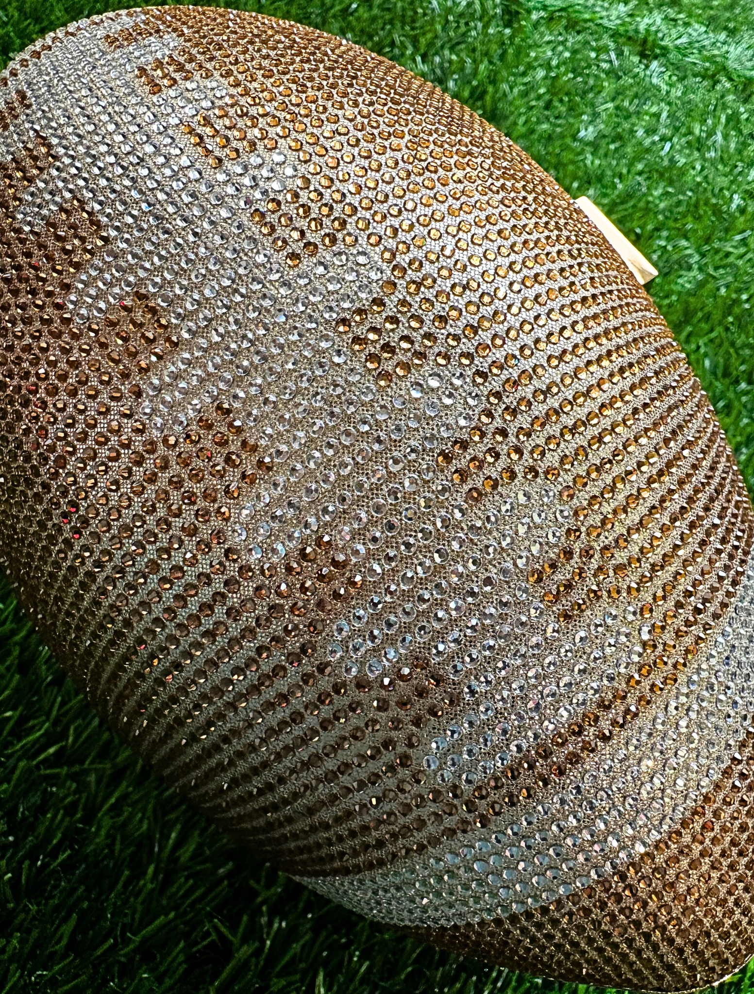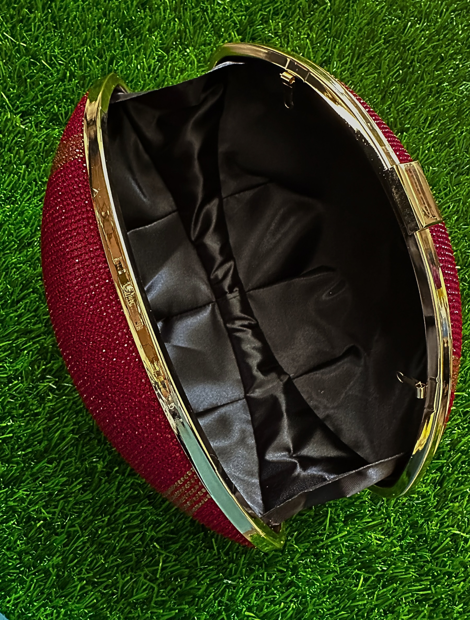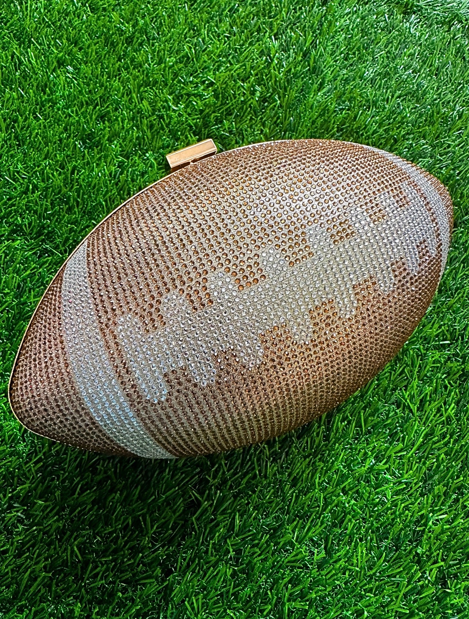 Score style points with this intricately rhinestone-embellished football clutch. Holds all of your essentials: wallet, keys, phone, and cosmetics. Clutch measures 9.4 inch x 5.5 inch x 5.1 inch. Polyester lining. Kiss lock. Removable gold-toned chain strap. Add a playful twist to your look for the big game with this statement bag!